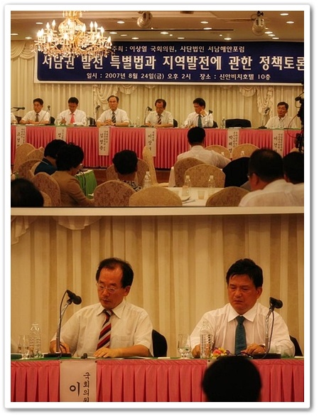 2007년 8월 24(금) 목포 신안비치호텔 10층 대연회장에서 목포지역 국회의원이신 이상열 국회의원과 사단법인 서남해안포럼이 주최한 서남권 발전 특별법과 지역발전에 관한 정책토론회가 있었습니다.
